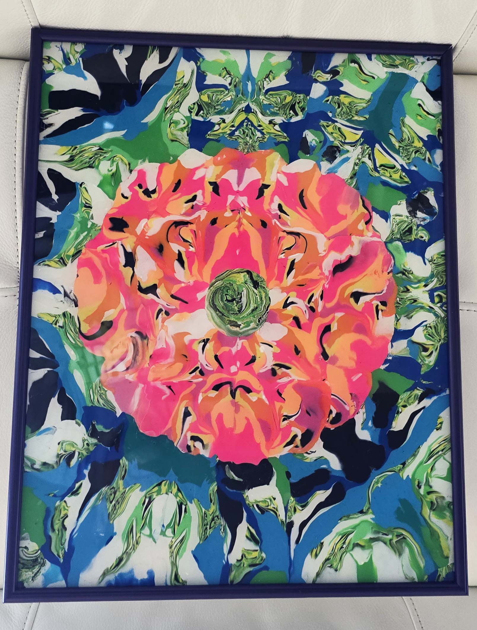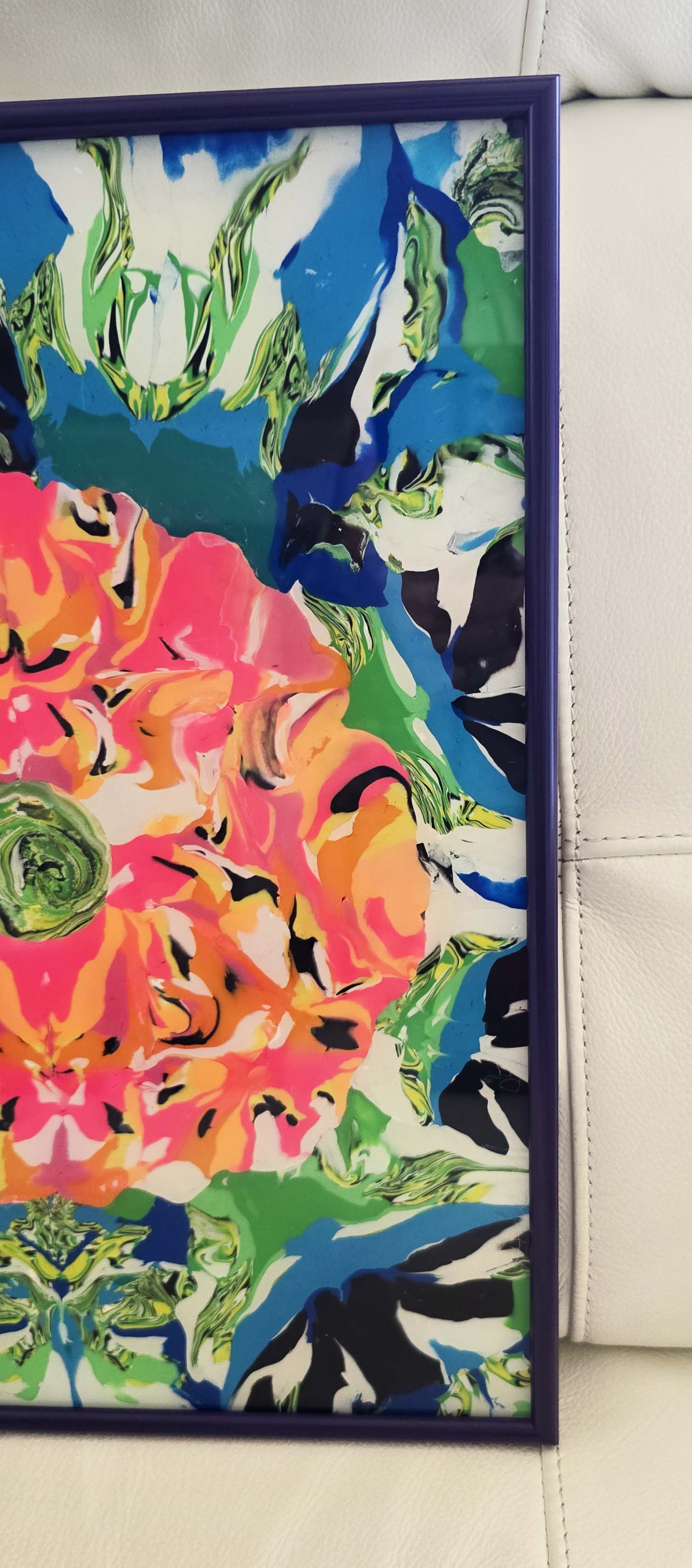 A radiant burst of neon petals blooms from the center like a living sun, its swirling layers shifting between floral form and pure energy. Surrounding blues, greens, and blacks ripple outward, creating a sense of growth in motion. With this piece, Carter transforms the natural world into an electrified, psychedelic vision—nature reimagined through rhythm and color.