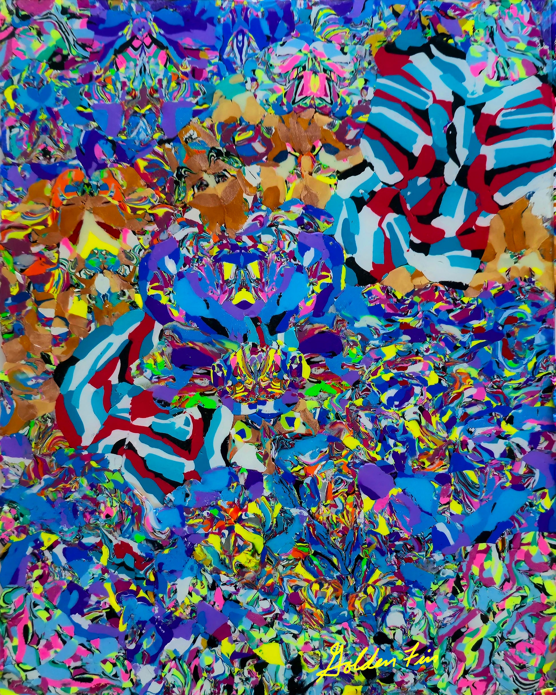 Bursting with layered blues, violets, and electrifying neon, Gunza Bloom resembles an underwater garden drifting in motion. Forms seem to shift between floral, aquatic, and geometric, encouraging the viewer to lean in and decode its energy. A hypnotic, swirling tapestry of color and depth.