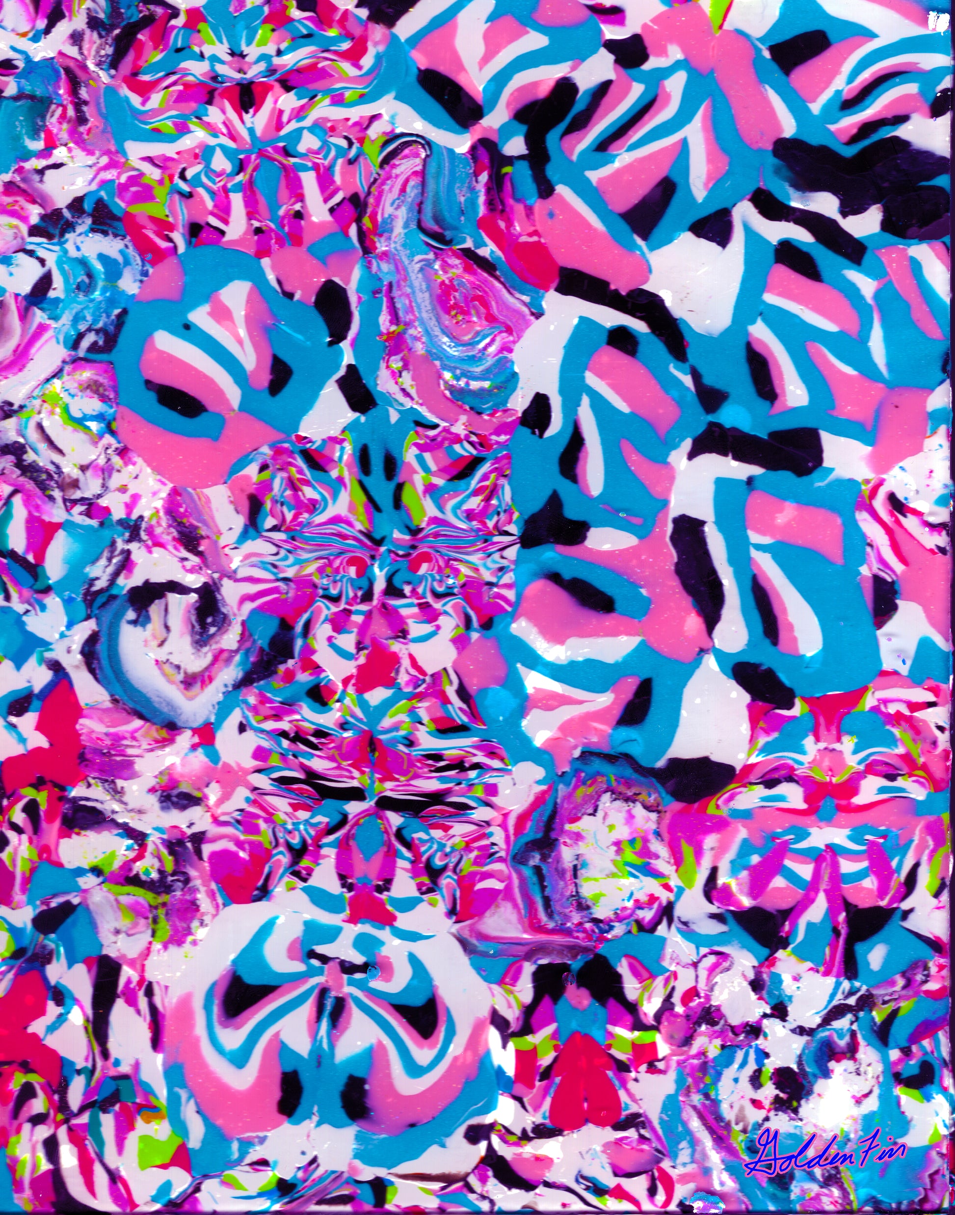 Bold stripes of pink, turquoise, and black swirl into mirrored patterns that pull the viewer into an emotional whirlwind. Beneath the candy-colored palette, shapes emerge and recede as if the piece is breathing inward and outward. Carter captures the feeling of introspection layered with expressive chaos—a portrait of the mind turning itself inside out.