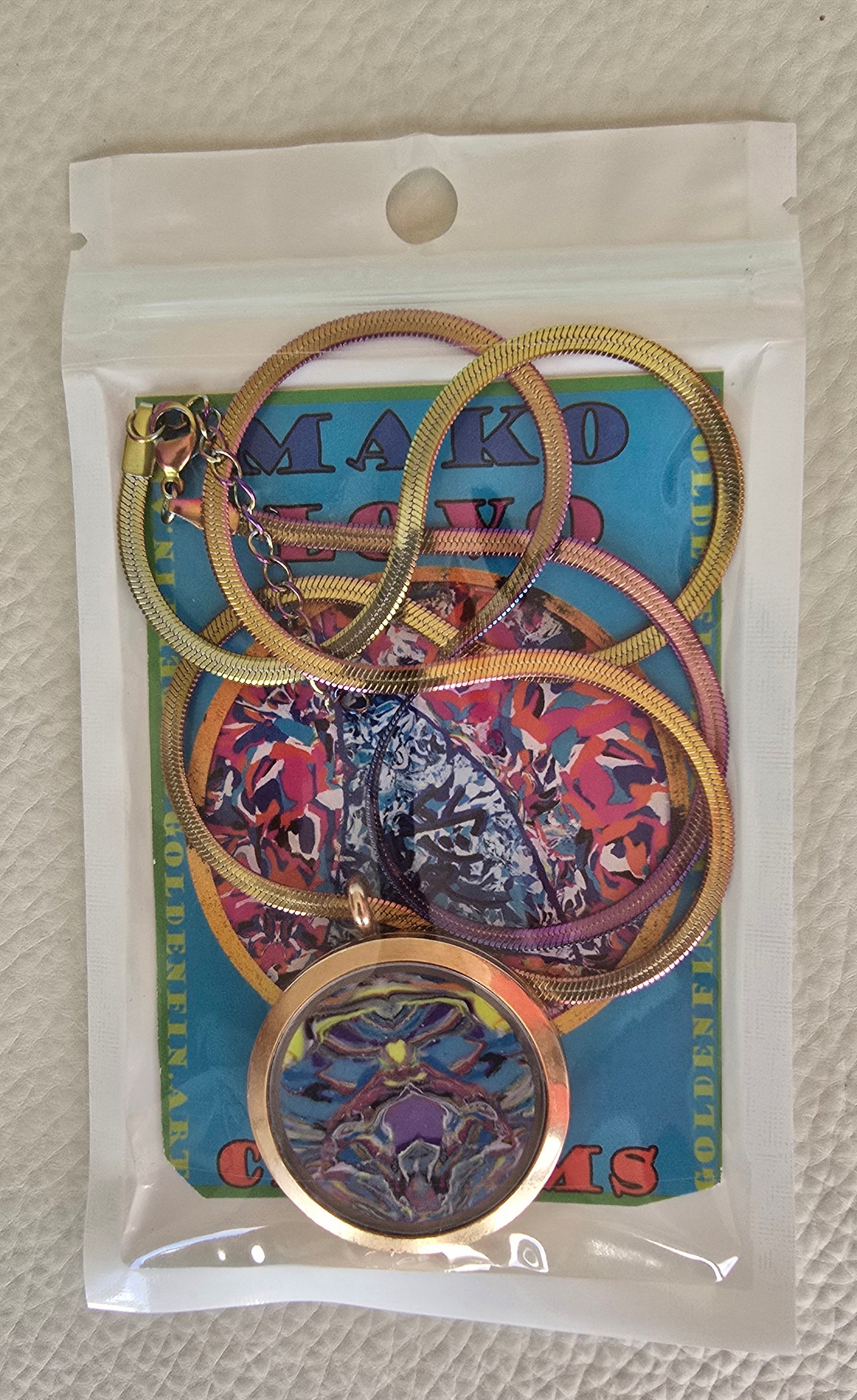 A miniature universe of swirling colors—turquoise, neon yellow, magenta, black, and violet—encased within a pendant. Though small, the piece carries the same dynamic energy of Carter’s larger works, capturing movement, spontaneity, and oceanic vibrance. A wearable artwork designed to bring Goldenfin’s signature chaos and beauty into everyday life.