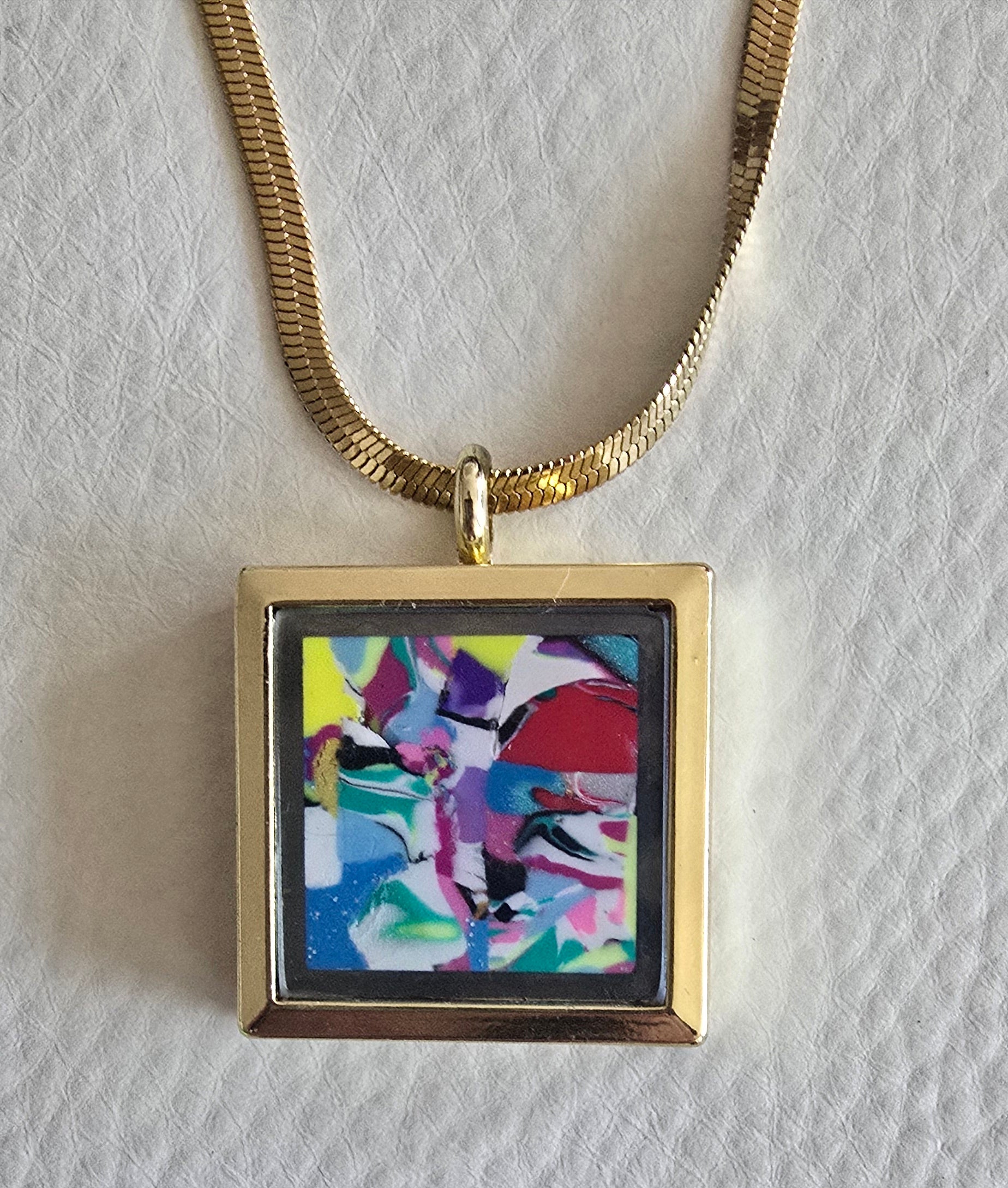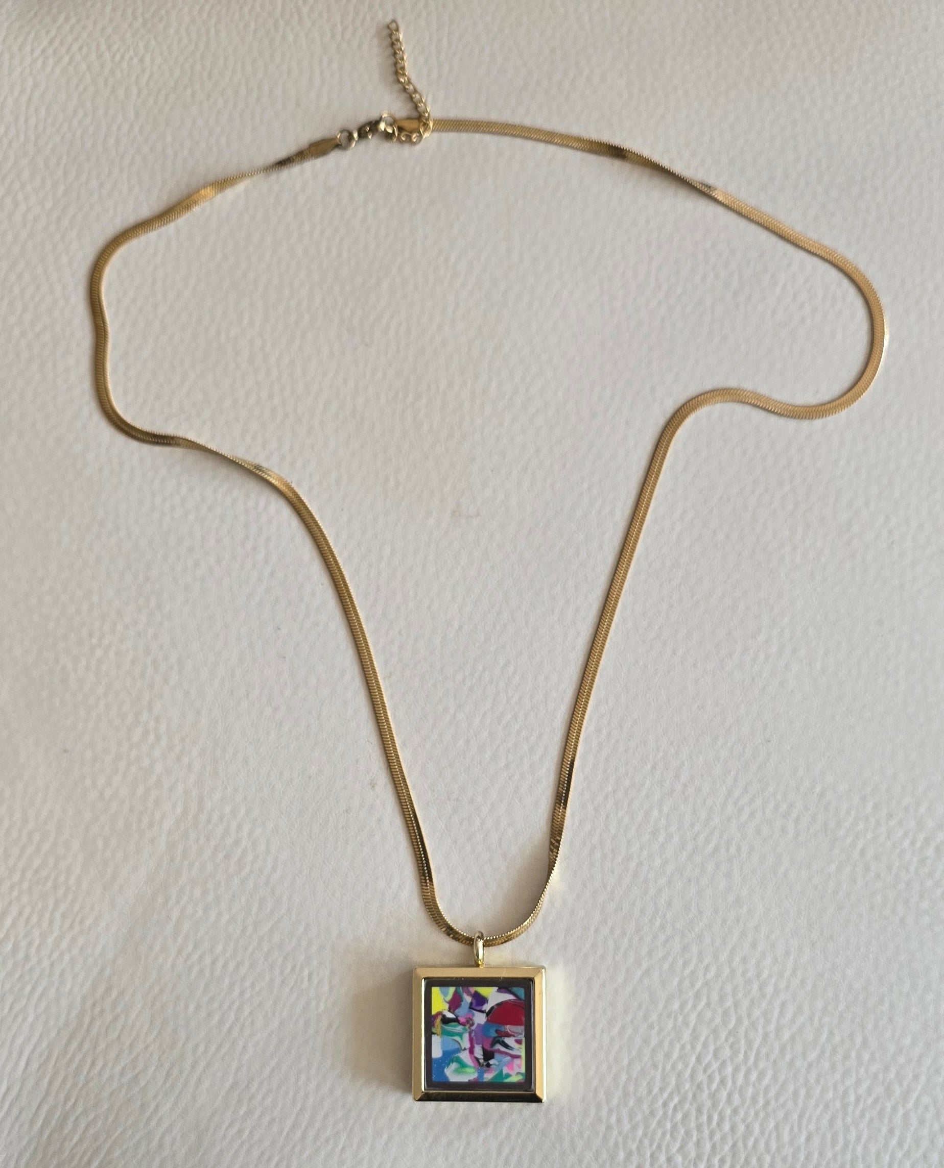A miniature universe of swirling colors—turquoise, neon yellow, magenta, black, and violet—encased within a pendant. Though small, the piece carries the same dynamic energy of Carter’s larger works, capturing movement, spontaneity, and oceanic vibrance. A wearable artwork designed to bring Goldenfin’s signature chaos and beauty into everyday life.