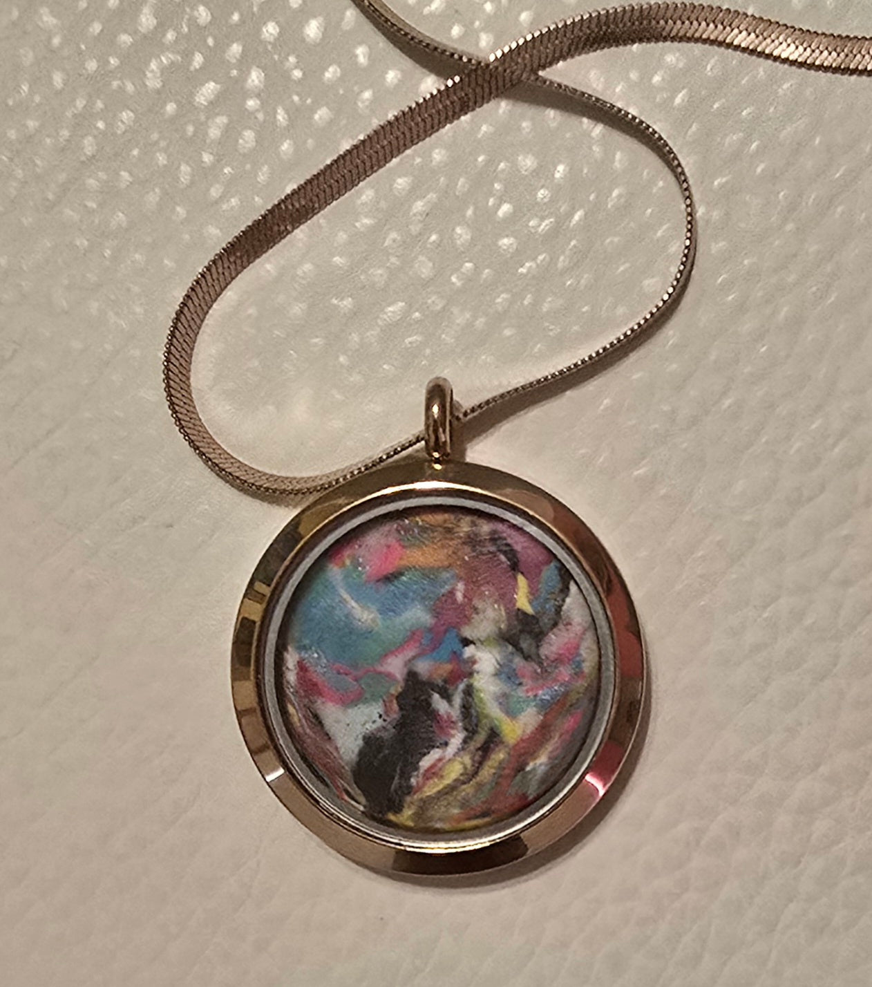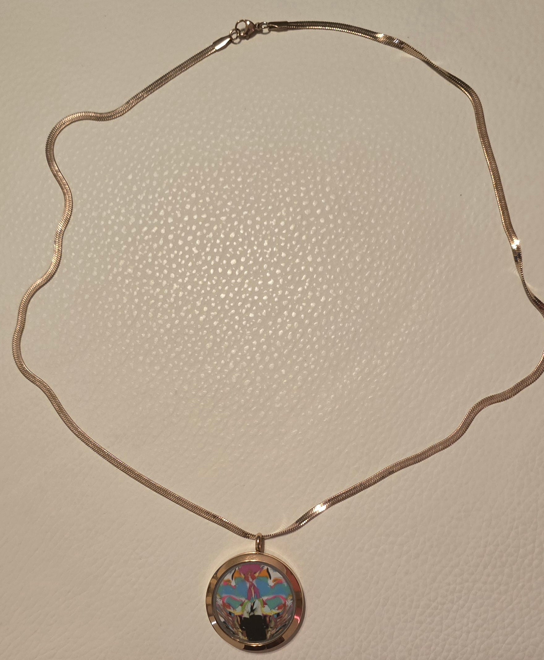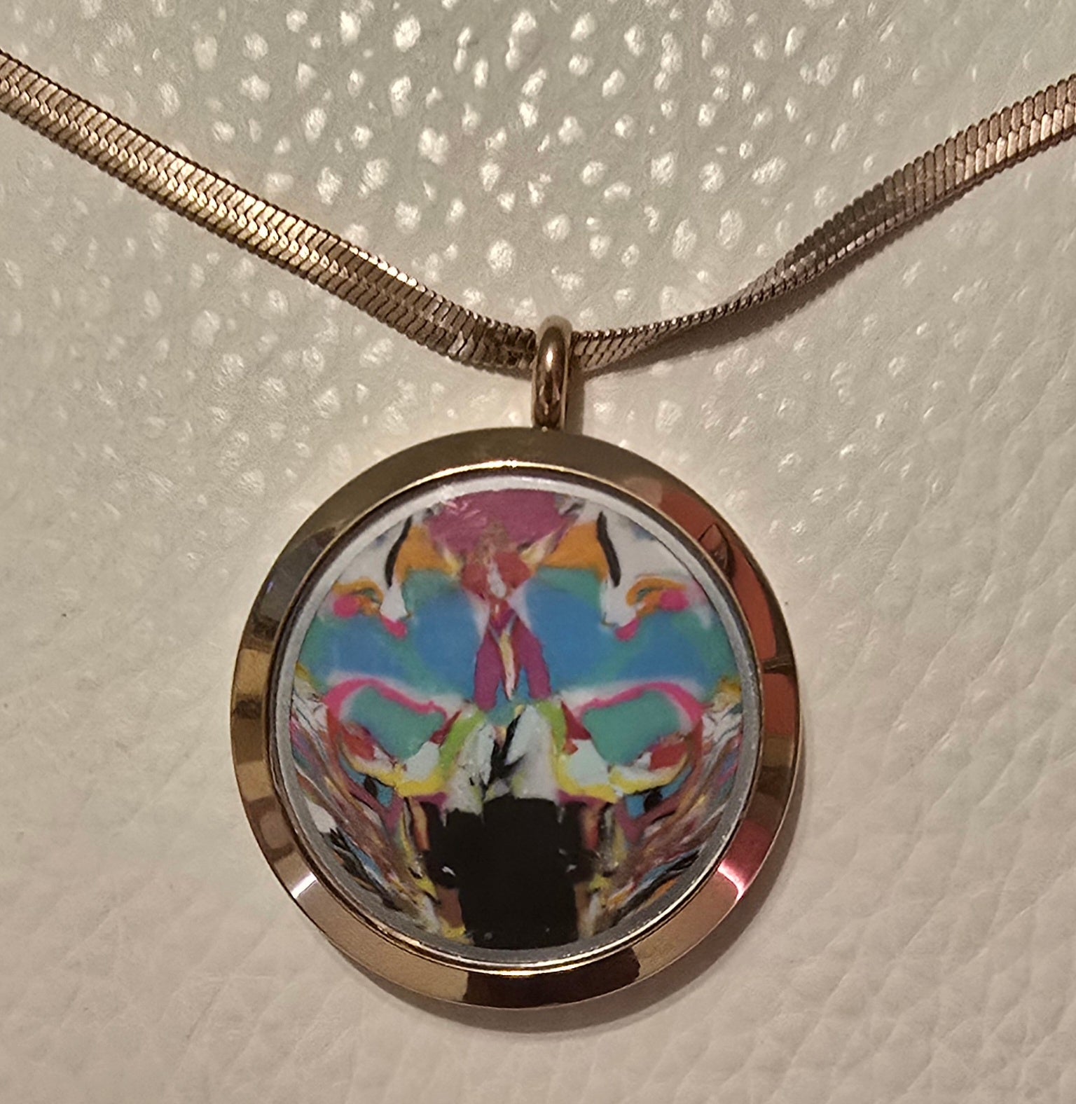 A miniature universe of swirling colors—turquoise, neon yellow, magenta, black, and violet—encased within a pendant. Though small, the piece carries the same dynamic energy of Carter’s larger works, capturing movement, spontaneity, and oceanic vibrance. A wearable artwork designed to bring Goldenfin’s signature chaos and beauty into everyday life.
