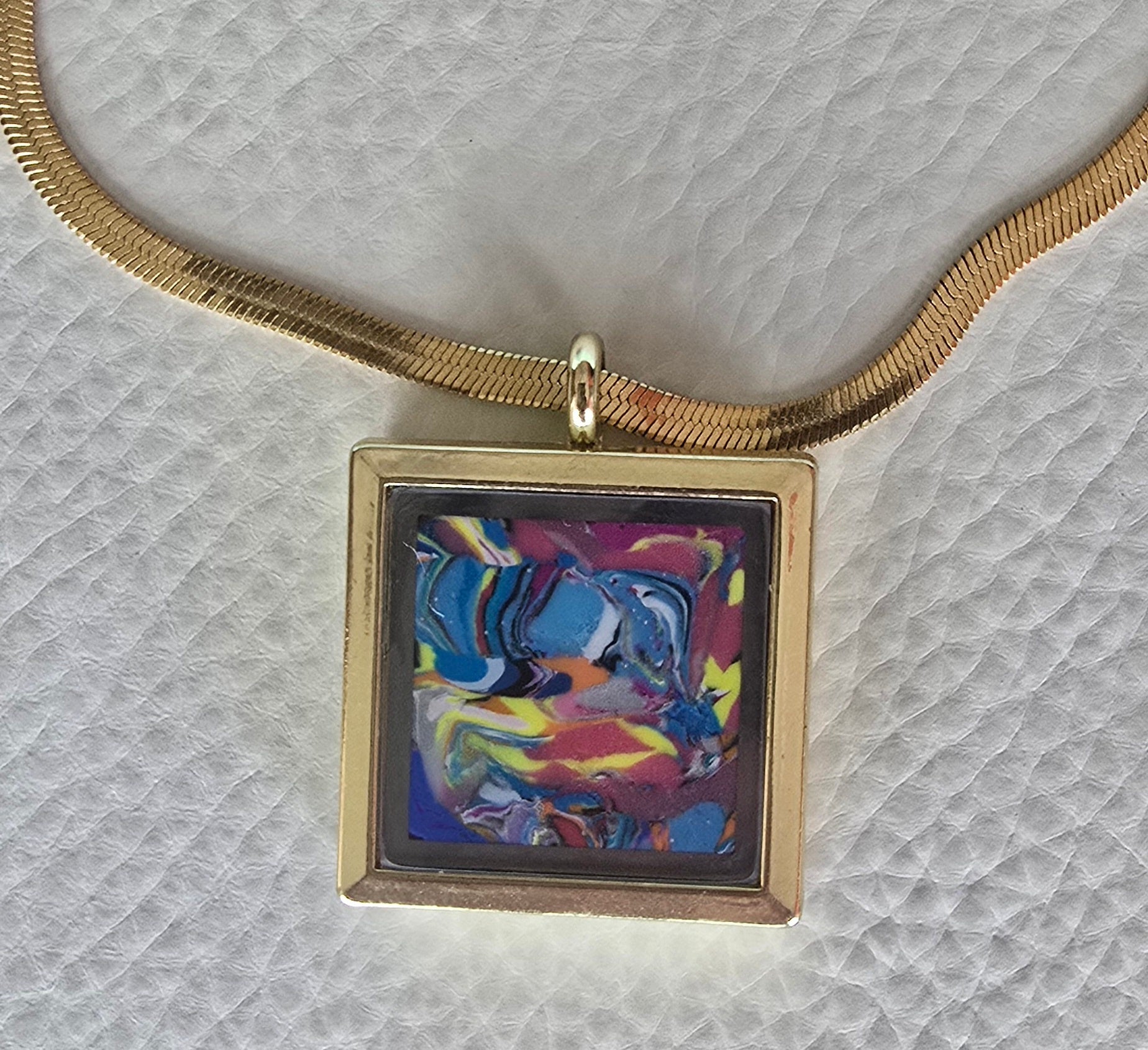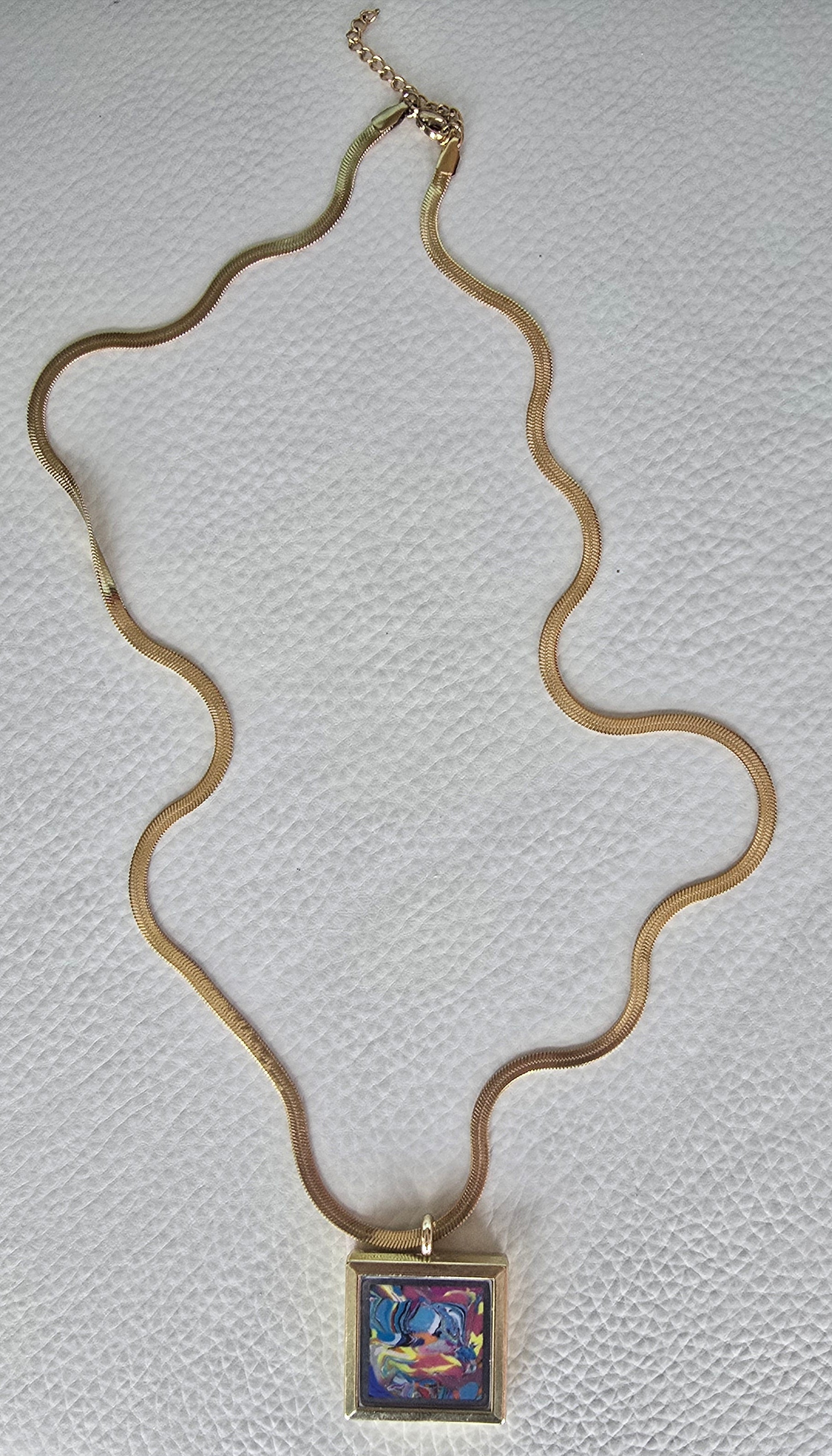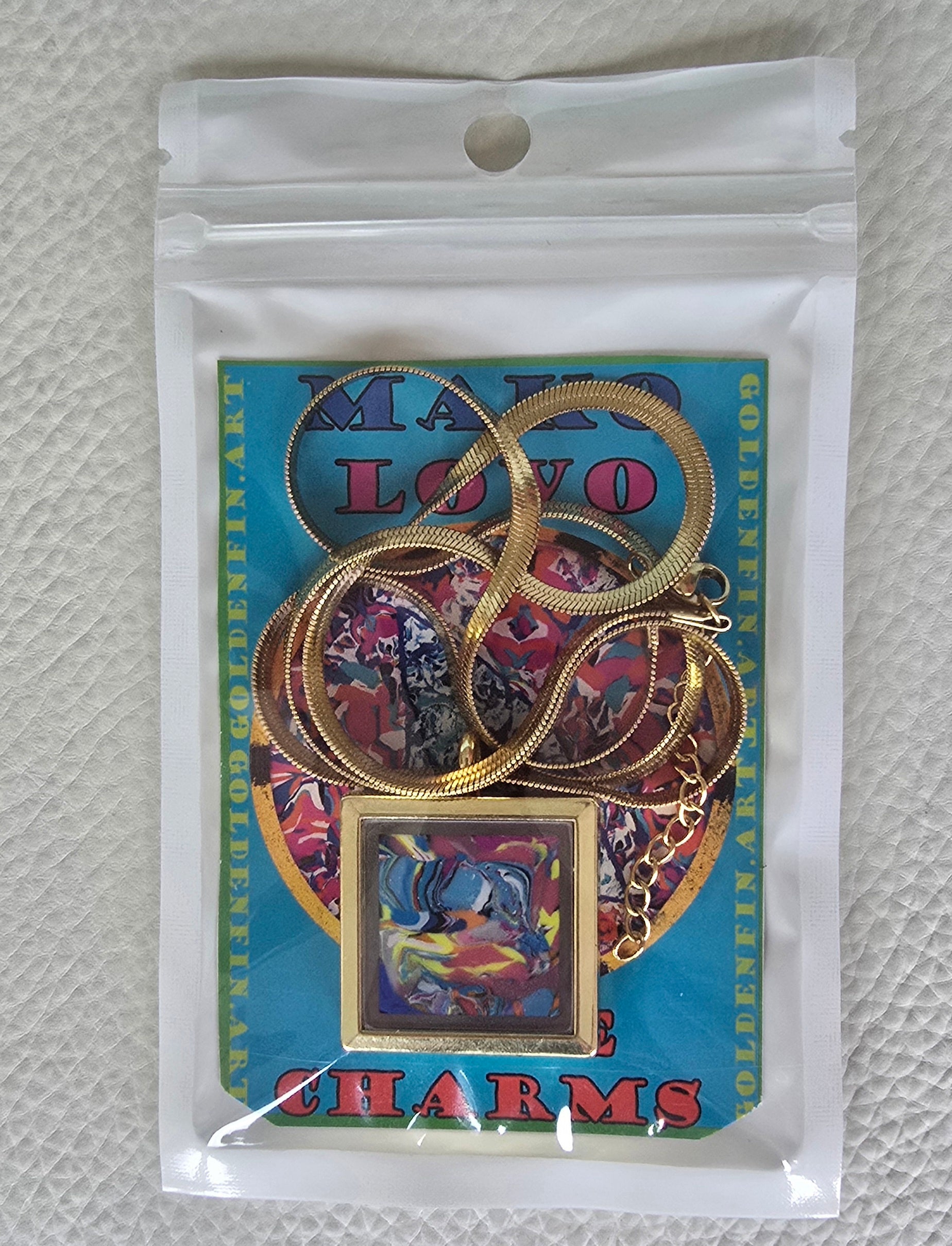 A miniature universe of swirling colors—turquoise, neon yellow, magenta, black, and violet—encased within a golden pendant. Though small, the piece carries the same dynamic energy of Carter’s larger works, capturing movement, spontaneity, and oceanic vibrance. A wearable artwork designed to bring Goldenfin’s signature chaos and beauty into everyday life.
