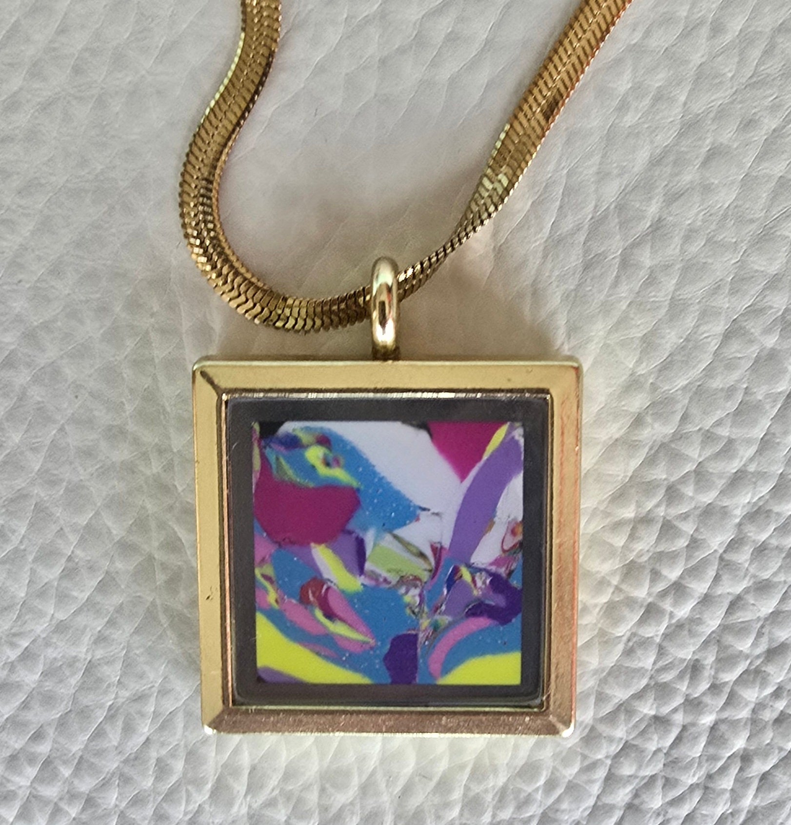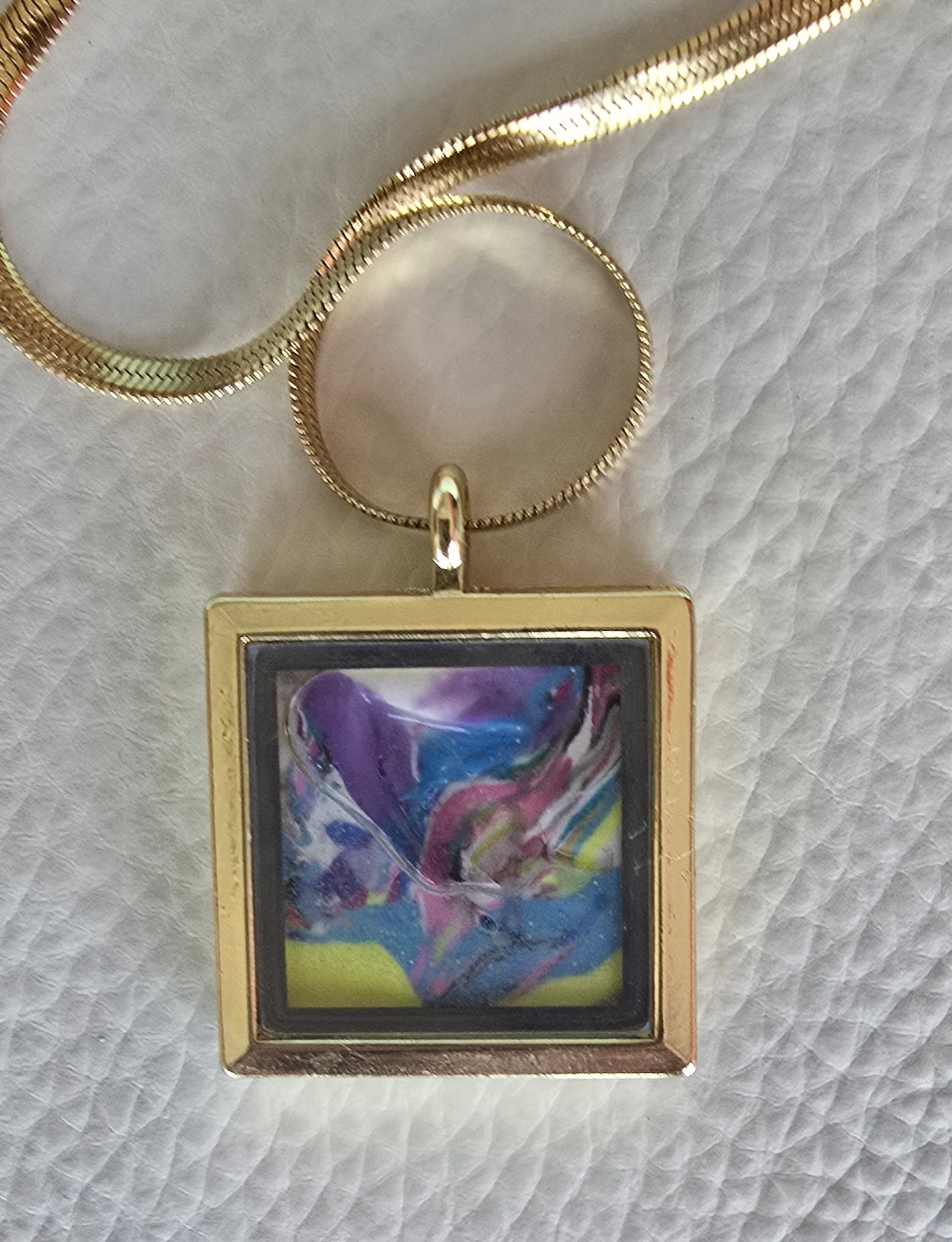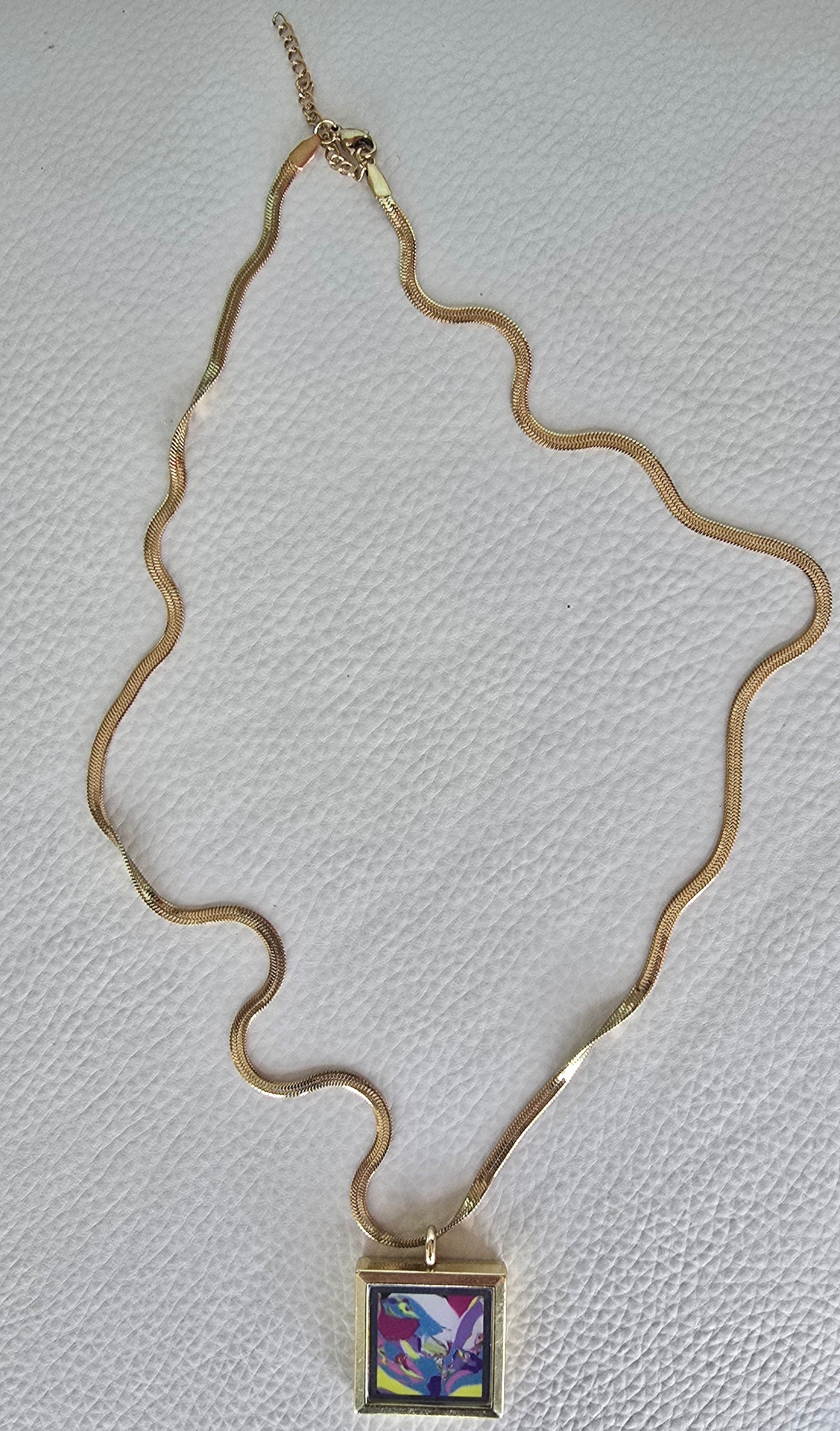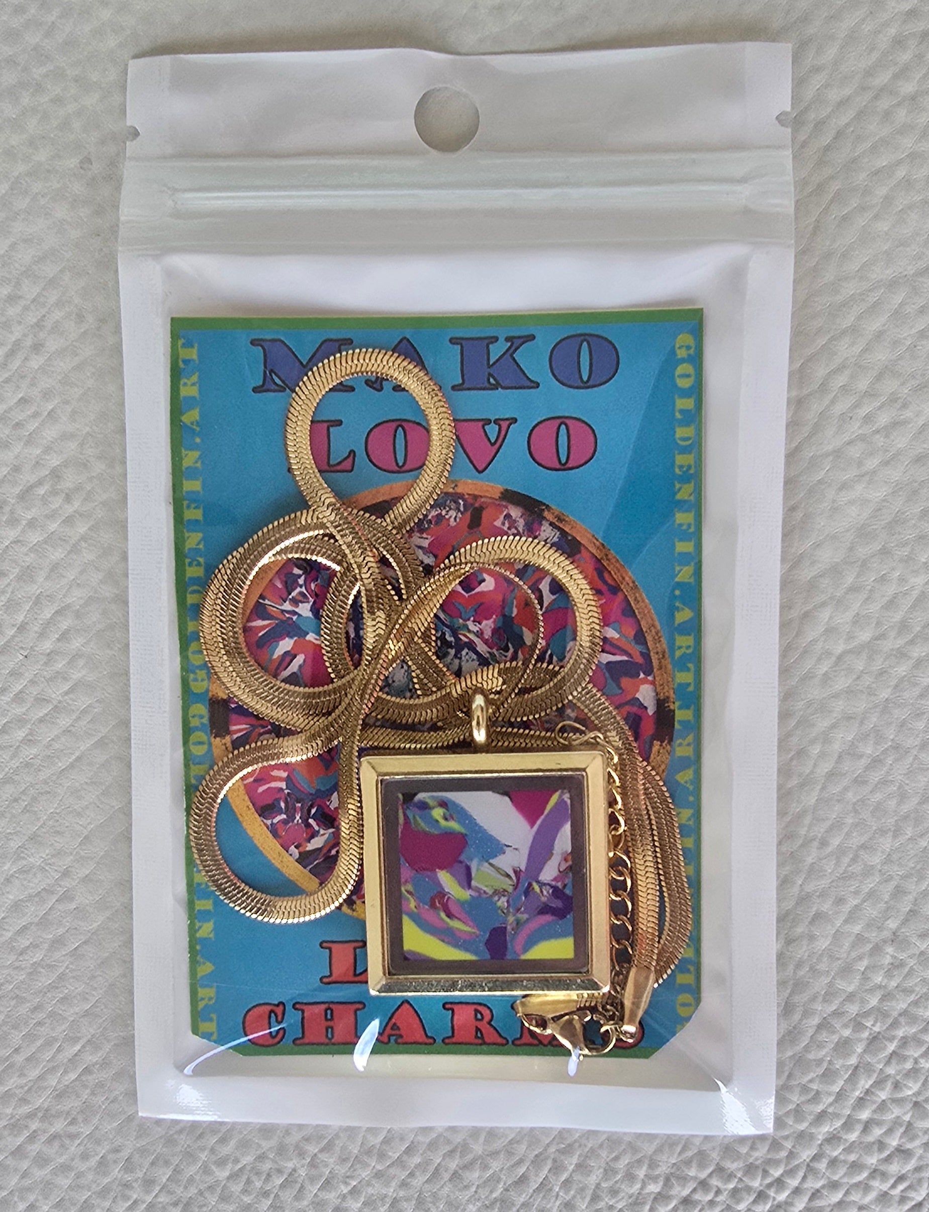 A miniature universe of swirling colors—turquoise, neon yellow, magenta, black, and violet—encased within a golden pendant. Though small, the piece carries the same dynamic energy of Carter’s larger works, capturing movement, spontaneity, and oceanic vibrance. A wearable artwork designed to bring Goldenfin’s signature chaos and beauty into everyday life.