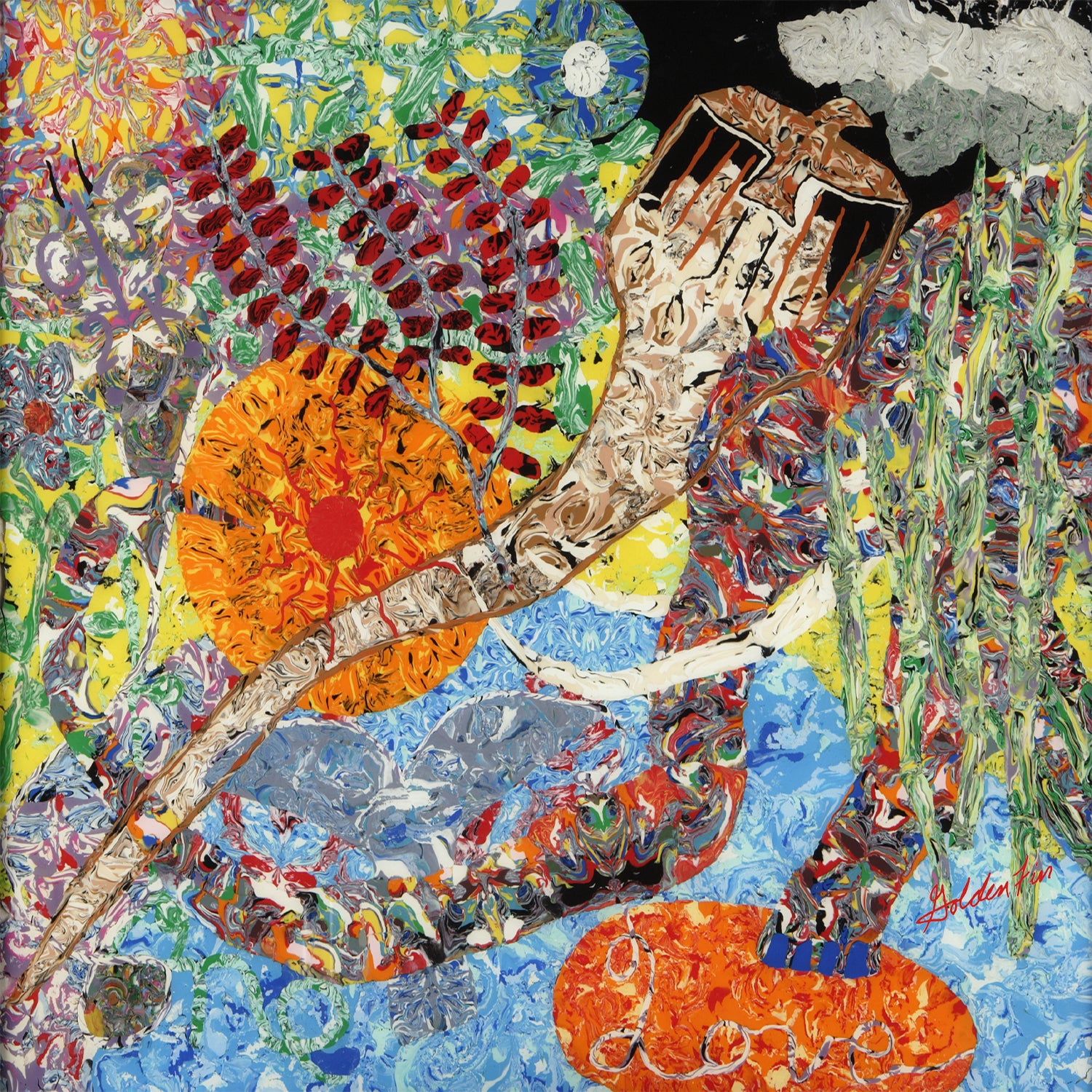 A radiant collision of color and movement, One Love 2 Suns gathers nature, figure, and emotion into a single pulsing moment. Warm oranges and yellows glow like sunlight against swirling blues, while a reclining form merges gently into its surroundings. Each clay stroke vibrates with a sense of unity—earth, body, and spirit in harmony.