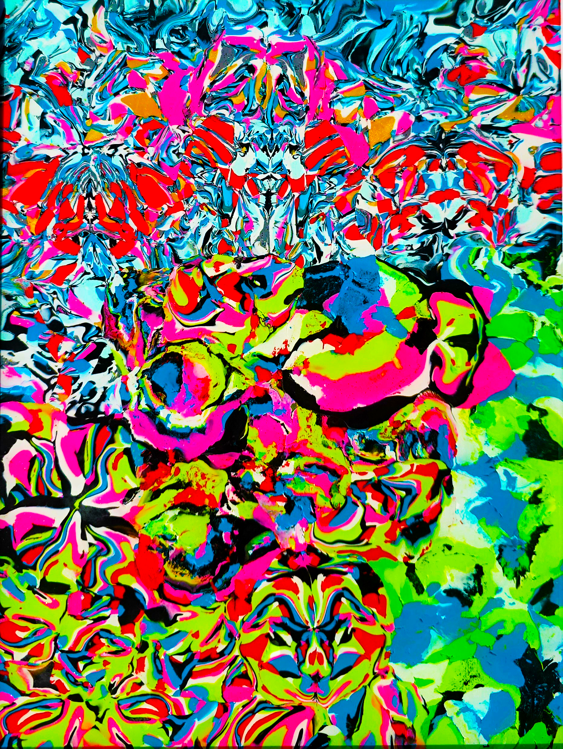 This electrifying piece erupts in hot neon yellows, magentas, blues, and greens, swirling into hidden faces and organic shapes. The top edge blooms like a canopy of flowers, while the lower half plunges into intense, almost volcanic color. Rocky Mountain Cat feels alive—an explosion of sound, motion, and abstract storytelling.