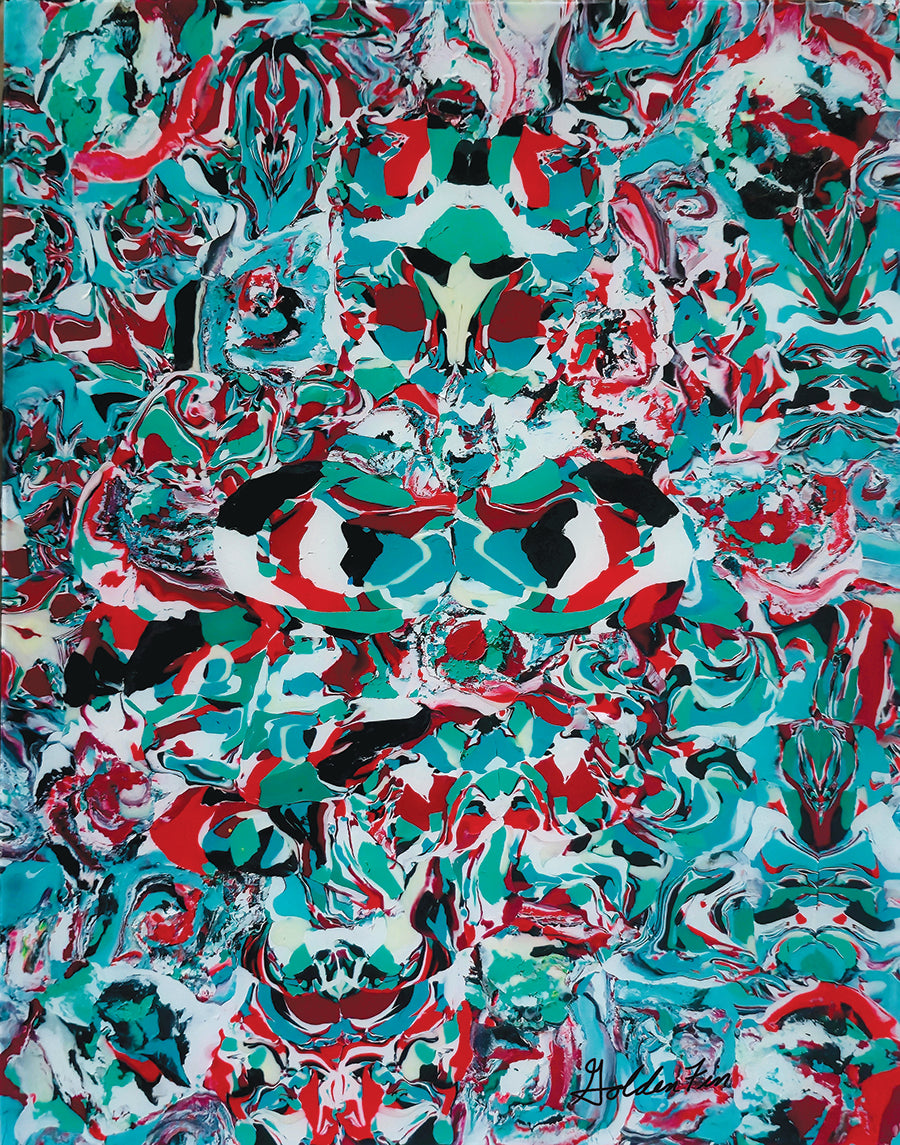 Deep emerald, crimson, and black swirl into an intricate abstract form that hints at a figure emerging from chaos. The composition feels spiritual, almost cathedral-like, with symmetrical patterns reminiscent of stained glass. Carter’s layering creates a sense of ascension and quiet intensity.